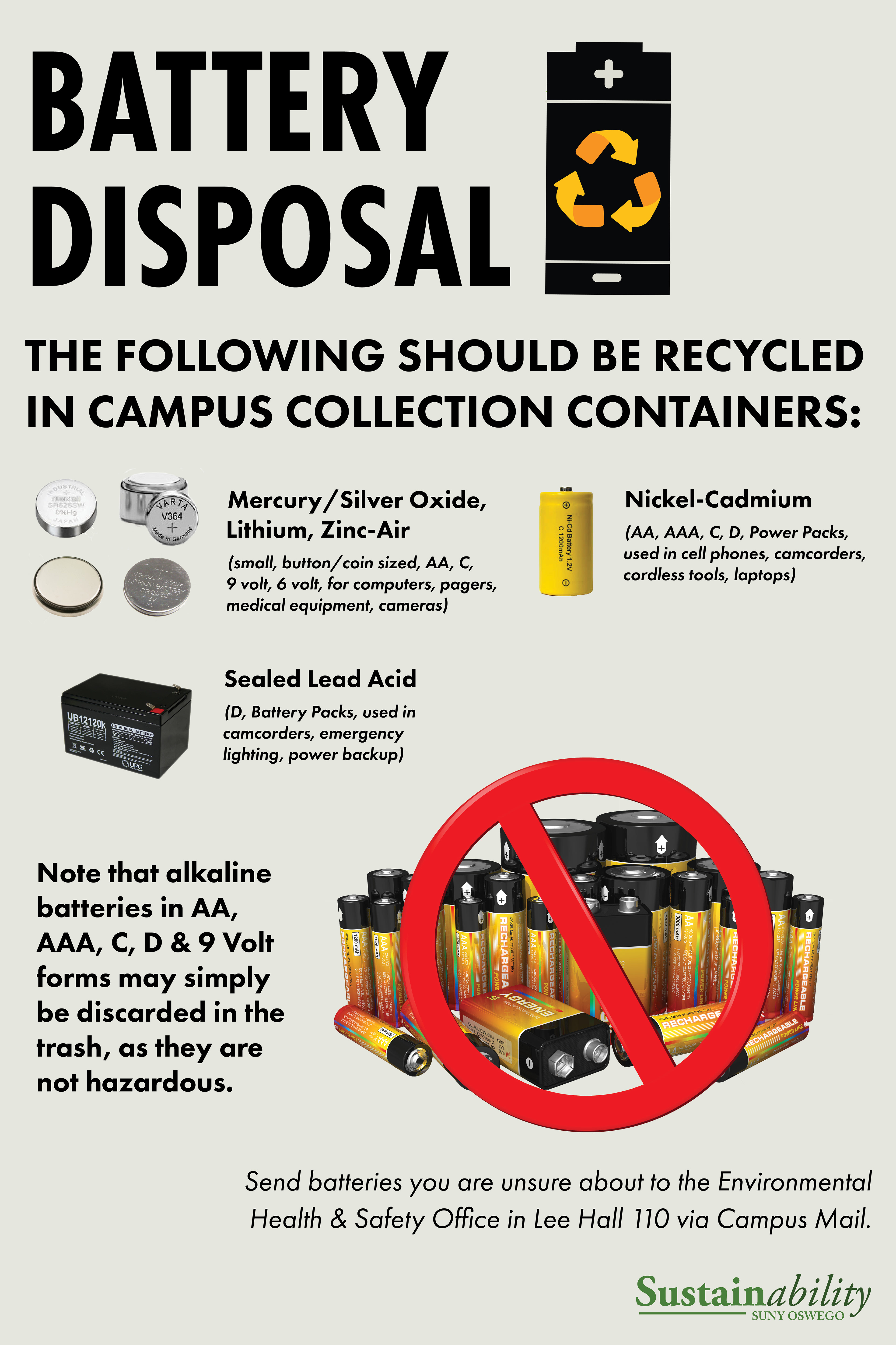 An infographic designed for the Environmental Health & Safety Office at State University of New York (SUNY) at Oswego. The purpose of this graphic was to clearly identify for students and faculty which batteries types should be recycled.